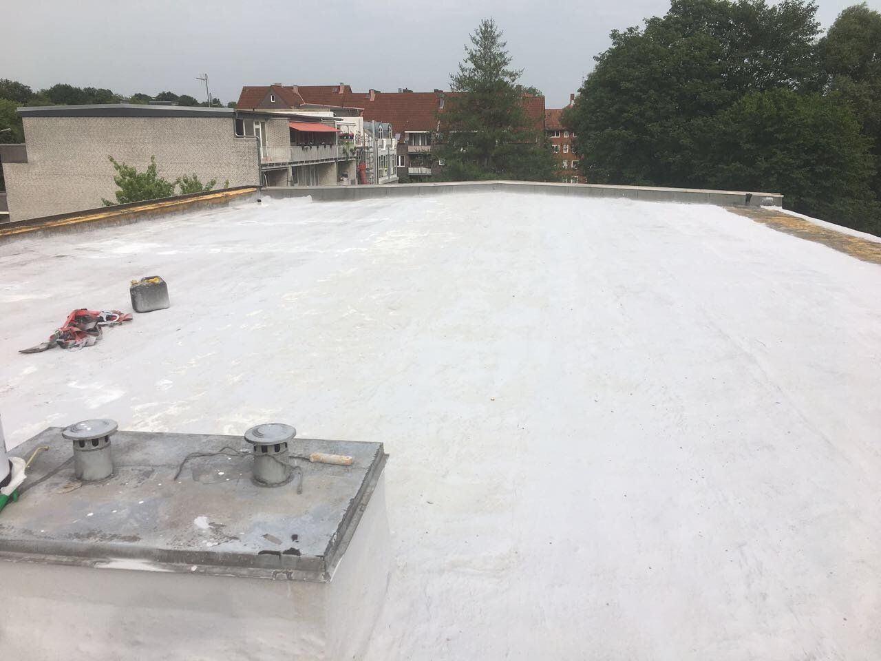 These UV protective coatings now make a flat roof foamed with PUR roof spray foam by isodach almost maintenance-free. Only dirt should be removed once a year to keep the water drains clean.