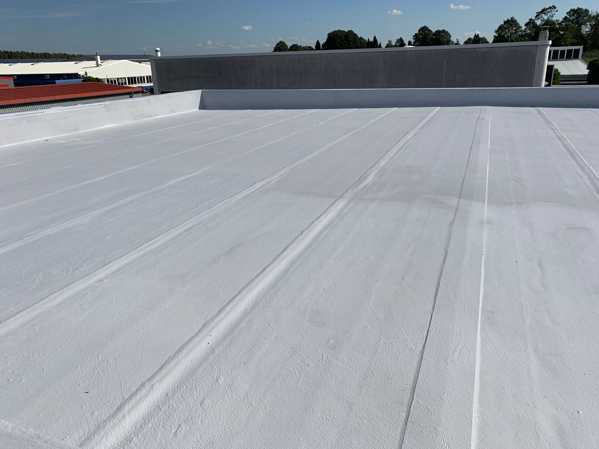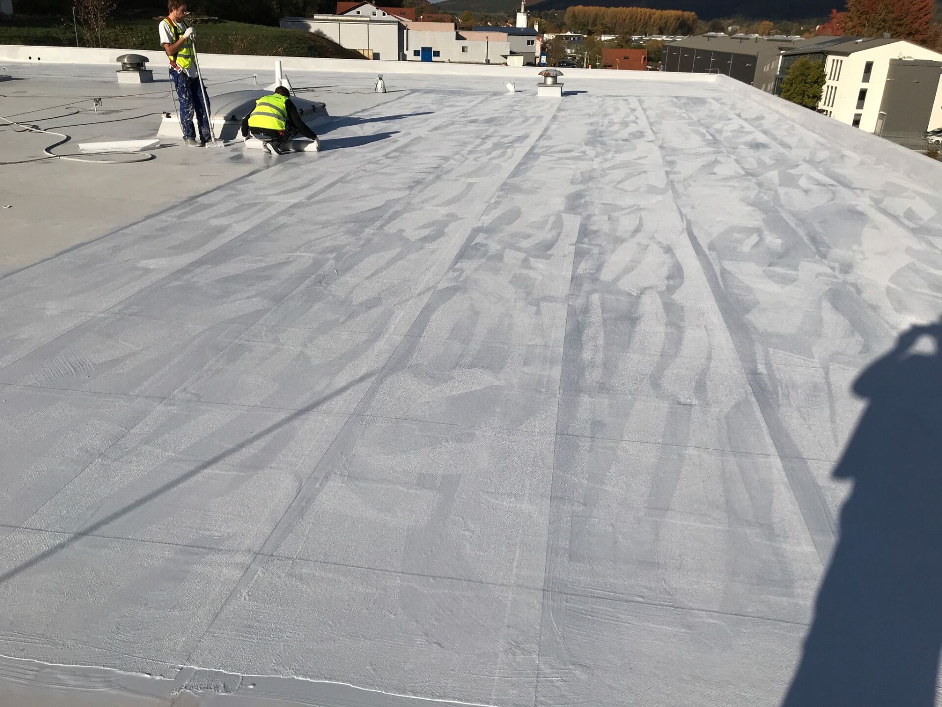 Once all connections and details have been prepared by hand with liquid plastic and fleece, the rest of the flat roof can be coated with liquid plastic and fleece. Our airless devices are used for this, with which daytime lines of 1,000 m² and more are possible.