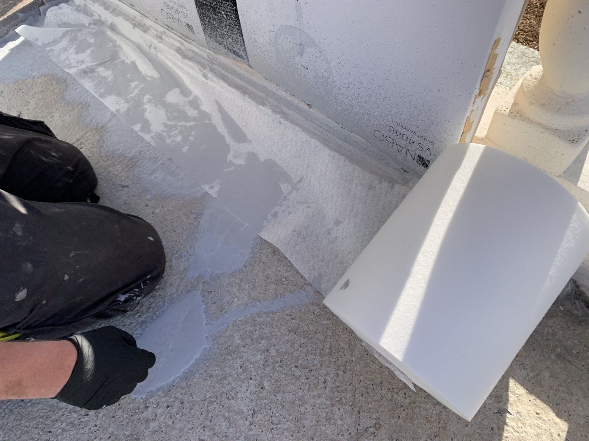 The resulting gap is professionally closed and secured with a KSA membrane (cold self-adhesive). Here, a KSA membrane is laid under the resulting gap with the adhesive surface facing upwards and the protective film is removed. At the same time, the two cut edges are pressed firmly onto the adhesive surface. In the second step, another KSA membrane is glued from above over the interface, thus closing the separating cut again.