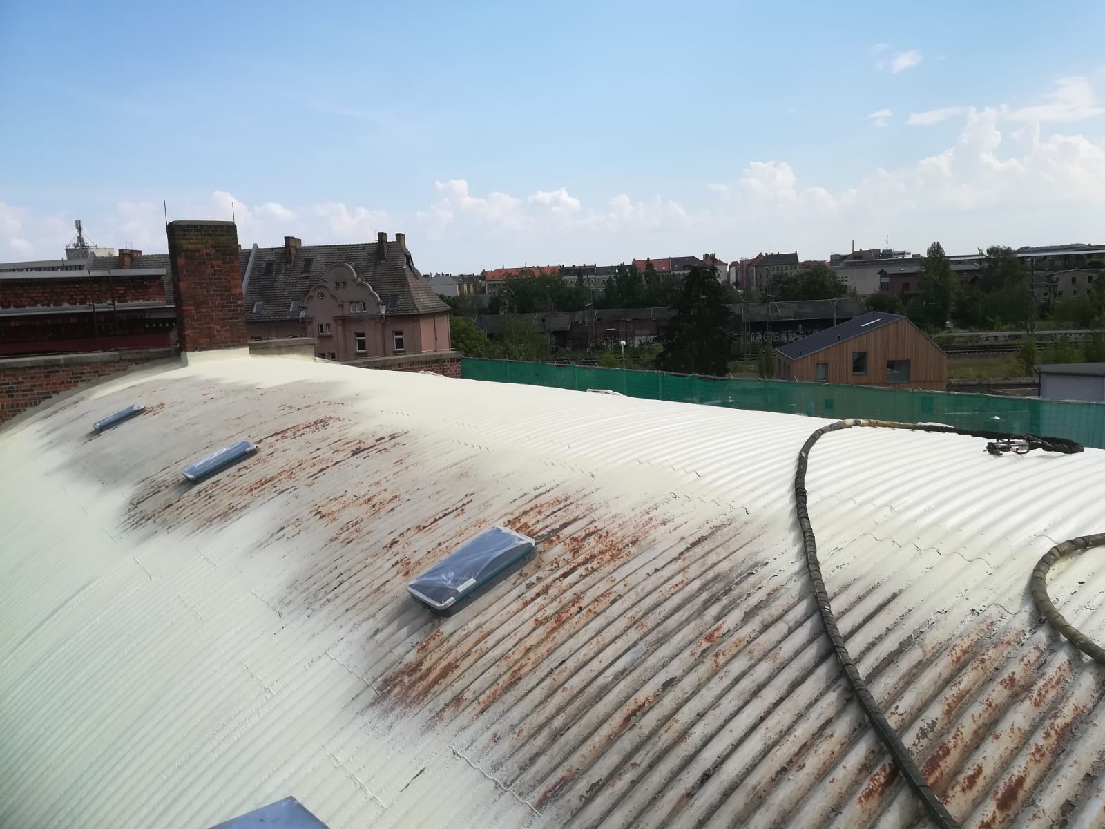 Le toit n'a pas été isolé avant le moussage. Les effets non entravés de la chaleur et du froid ont entraîné l'arrachement de certaines vis de fixation en raison des forces de cisaillement résultant de l'expansion longitudinale des tôles. D'autres vis ont créé des trous allongés dans les tôles en raison de l'expansion constante. Il y a eu d’innombrables petites fuites.